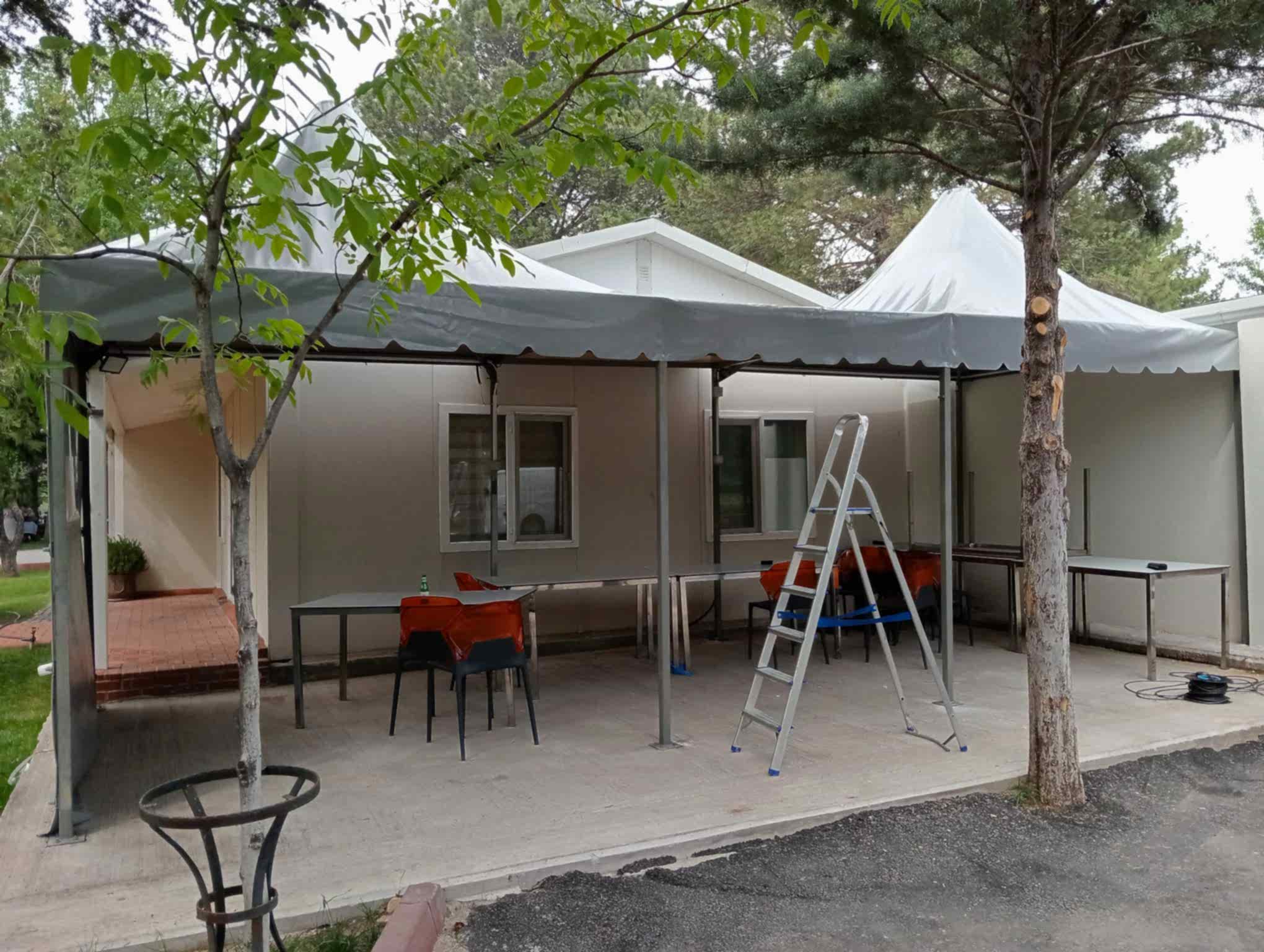 Üretilen çadırlar, profesyonel ekipler tarafından kuruluma hazırlanır. Montaj aşamasında: